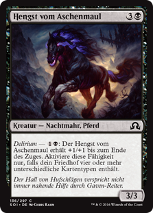 | Rules | Delirium — : Stallion of Ashmouth gets +1/+1 until end of turn. Activate only if there are four or more card types among cards in your graveyard. |