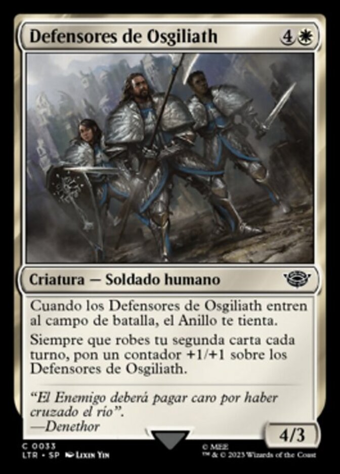 | Rules | When Stalwarts of Osgiliath enters the battlefield, the Ring tempts you. Whenever you draw your second card each turn, put a +1/+1 counter on Stalwarts of Osgiliath. |