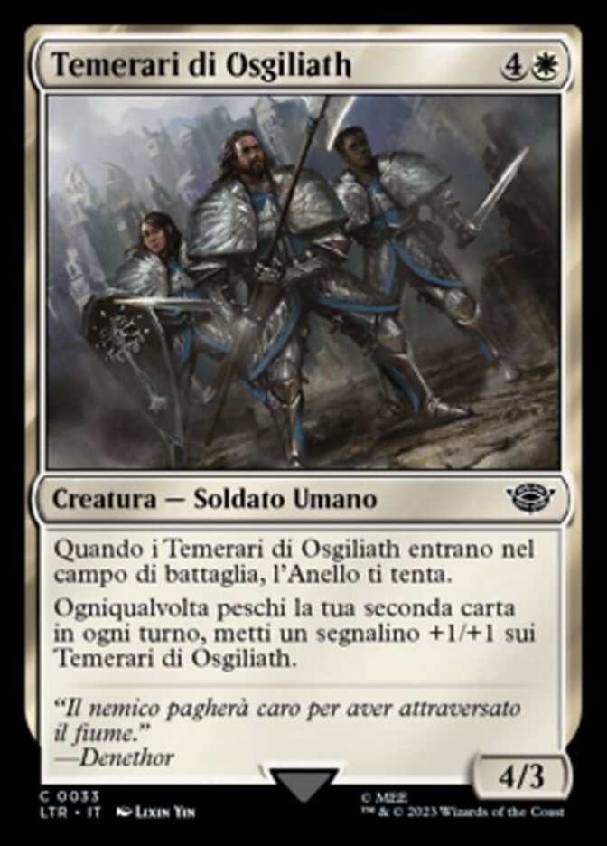 | Rules | When Stalwarts of Osgiliath enters the battlefield, the Ring tempts you. Whenever you draw your second card each turn, put a +1/+1 counter on Stalwarts of Osgiliath. |