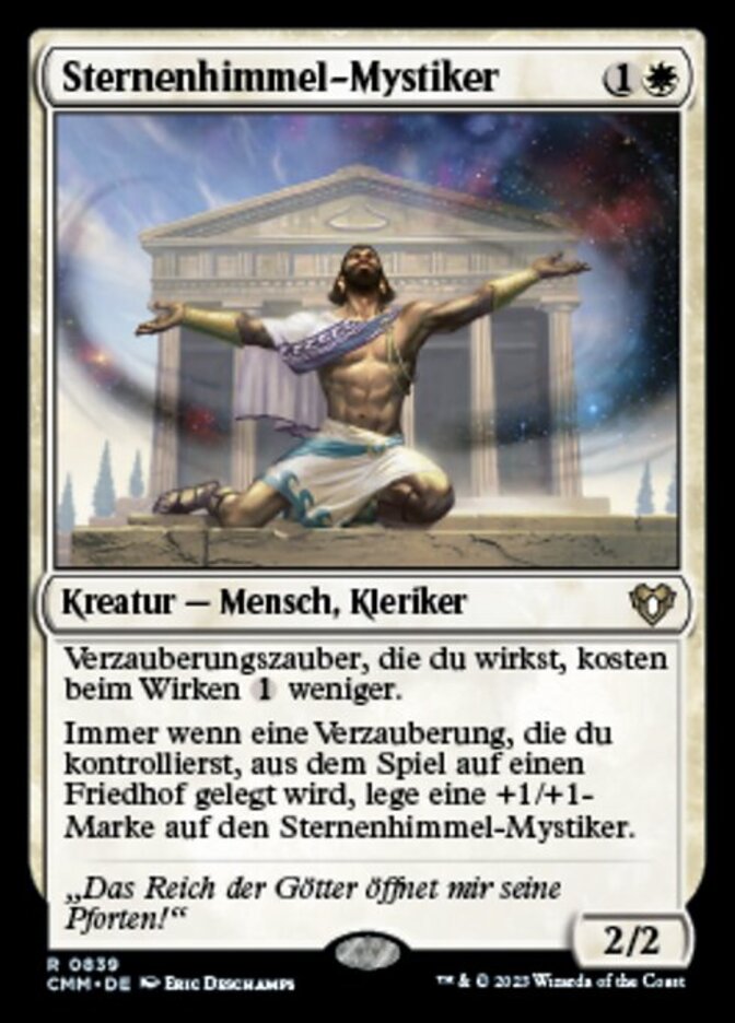 | Rules | Enchantment spells you cast cost less to cast. Whenever an enchantment you control is put into a graveyard from the battlefield, put a +1/+1 counter on Starfield Mystic. |