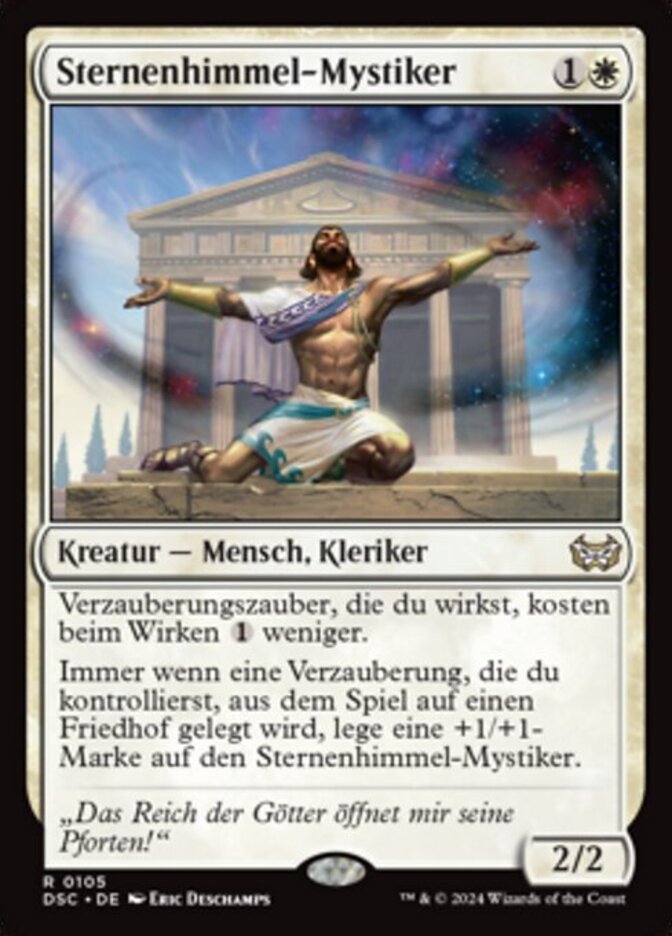 | Rules | Enchantment spells you cast cost less to cast. Whenever an enchantment you control is put into a graveyard from the battlefield, put a +1/+1 counter on Starfield Mystic. |