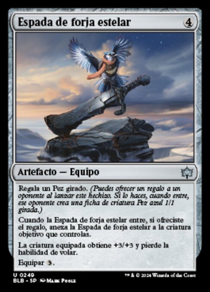 | Rules | Gift a tapped Fish (You may promise an opponent a gift as you cast this spell. If you do, when it enters, they create a tapped 1/1 blue Fish creature token.) When Starforged Sword enters, if the gift was promised, attach Starforged Sword to target creature you control. Equipped creature gets +3/+3 and loses flying. Equip |
