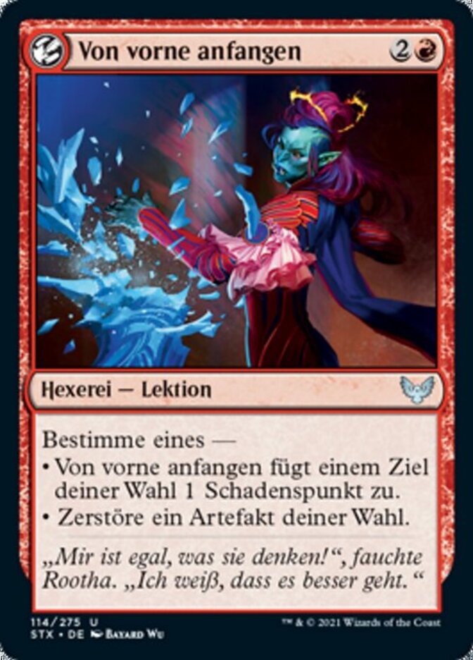 | Rules | Choose one — • Start from Scratch deals 1 damage to any target. • Destroy target artifact. |