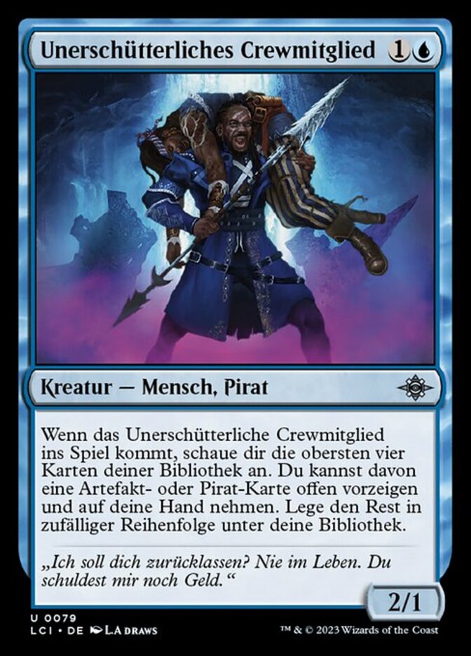 Rules When Staunch Crewmate enters the battlefield, look at the top four cards of your library. You may reveal an artifact or Pirate card from among them and put it into your hand. Put the rest on the bottom of your library in a random order.