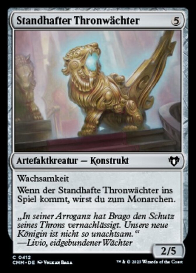 | Rules | Vigilance When Staunch Throneguard enters the battlefield, you become the monarch. |
