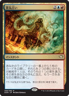 | Rules | Reveal the top five cards of your library and separate them into two piles. An opponent chooses one of those piles. Put that pile into your hand and the other into your graveyard. |