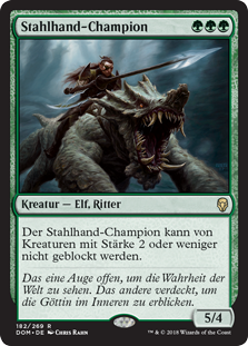 | Rules | Steel Leaf Champion can't be blocked by creatures with power 2 or less. |