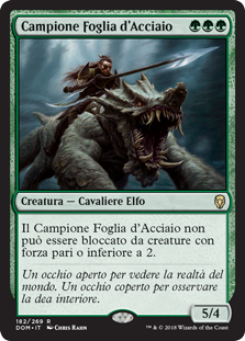 | Rules | Steel Leaf Champion can't be blocked by creatures with power 2 or less. |