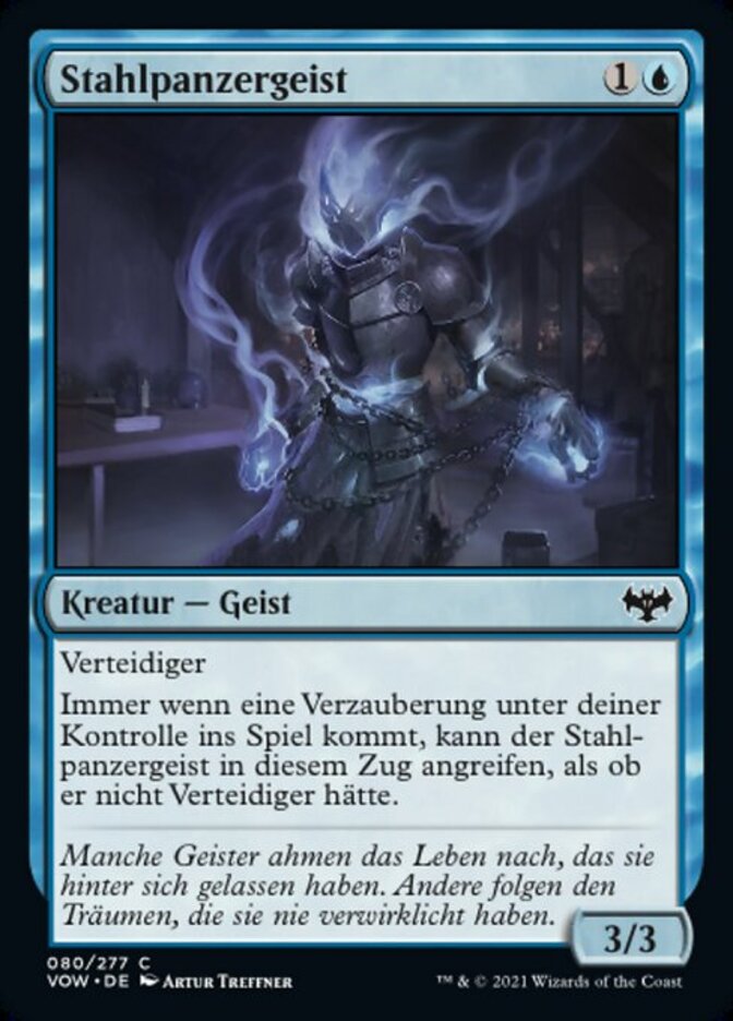 | Rules | Defender Whenever an enchantment enters the battlefield under your control, Steelclad Spirit can attack this turn as though it didn't have defender. |
