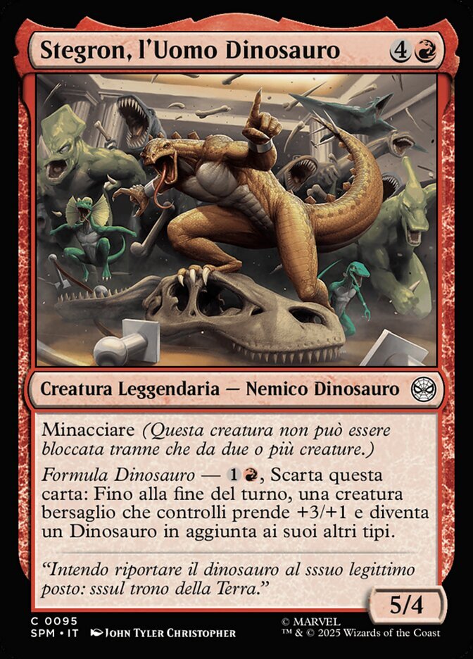 | Rules | Menace (This creature can't be blocked except by two or more creatures.) Dinosaur Formula — , Discard this card: Until end of turn, target creature you control gets +3/+1 and becomes a Dinosaur in addition to its other types. |