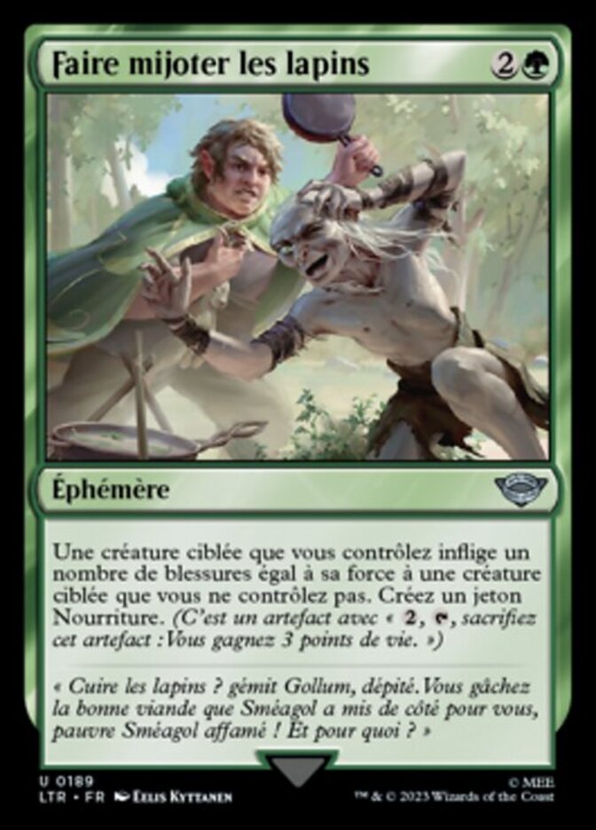 | Flavor | "Stew the rabbits?" squealed Gollum in dismay. "Spoil beautiful meat Sméagol saved saved for you, poor hungry Sméagol! What for?" |