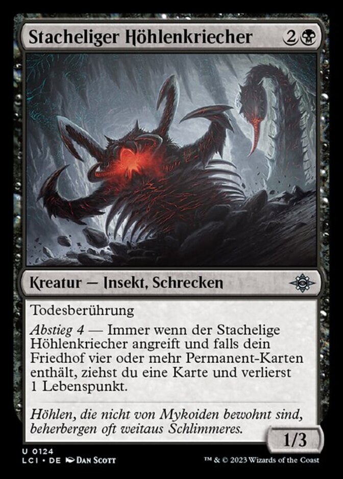 | Rules | Deathtouch Descend 4 — Whenever Stinging Cave Crawler attacks, if there are four or more permanent cards in your graveyard, you draw a card and you lose 1 life. |