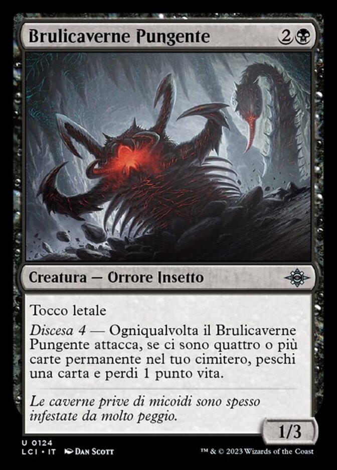 | Rules | Deathtouch Descend 4 — Whenever Stinging Cave Crawler attacks, if there are four or more permanent cards in your graveyard, you draw a card and you lose 1 life. |