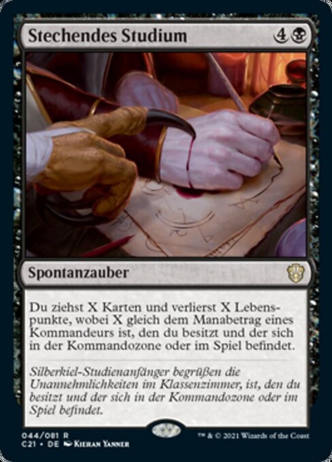 | Rules | You draw X cards and you lose X life, where X is the mana value of a commander you own on the battlefield or in the command zone. |