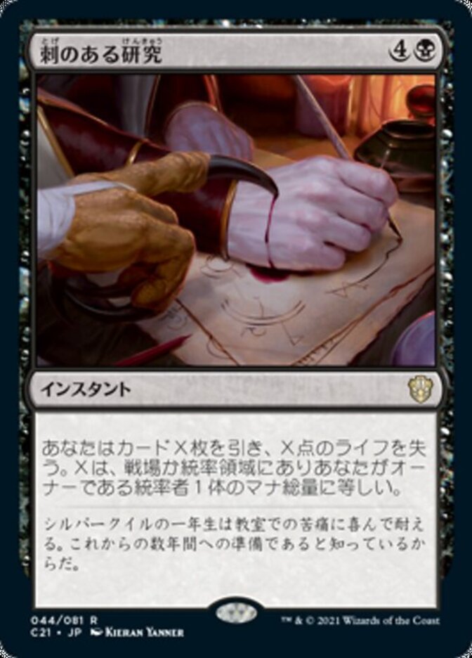 | Rules | You draw X cards and you lose X life, where X is the mana value of a commander you own on the battlefield or in the command zone. |