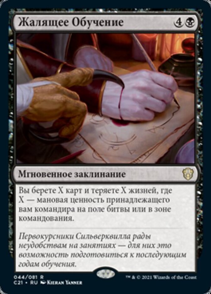 | Rules | You draw X cards and you lose X life, where X is the mana value of a commander you own on the battlefield or in the command zone. |