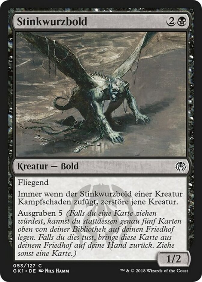 | Rules | Flying Whenever Stinkweed Imp deals combat damage to a creature, destroy that creature. Dredge 5 (If you would draw a card, you may mill five cards instead. If you do, return this card from your graveyard to your hand.) |