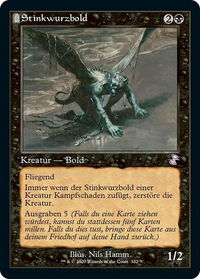 | Rules | Flying Whenever Stinkweed Imp deals combat damage to a creature, destroy that creature. Dredge 5 (If you would draw a card, you may mill five cards instead. If you do, return this card from your graveyard to your hand.) |