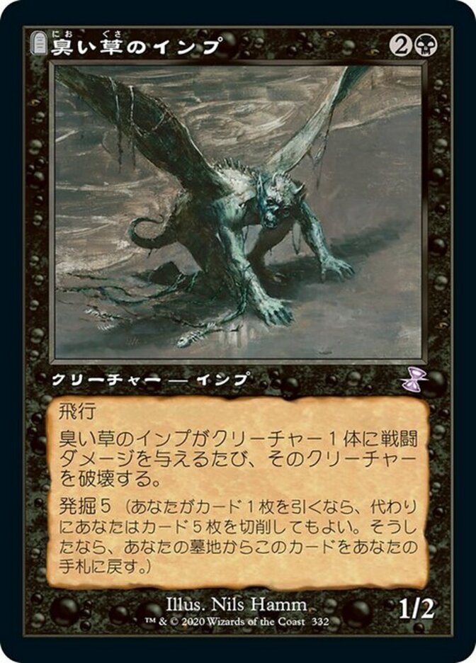 | Rules | Flying Whenever Stinkweed Imp deals combat damage to a creature, destroy that creature. Dredge 5 (If you would draw a card, you may mill five cards instead. If you do, return this card from your graveyard to your hand.) |
