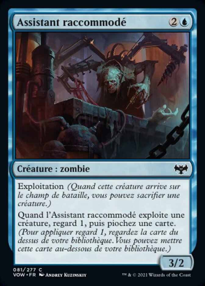 | Rules | Exploit (When this creature enters the battlefield, you may sacrifice a creature.) When Stitched Assistant exploits a creature, scry 1, then draw a card. (To scry 1, look at the top card of your library, then you may put that card on the bottom of your library.) |