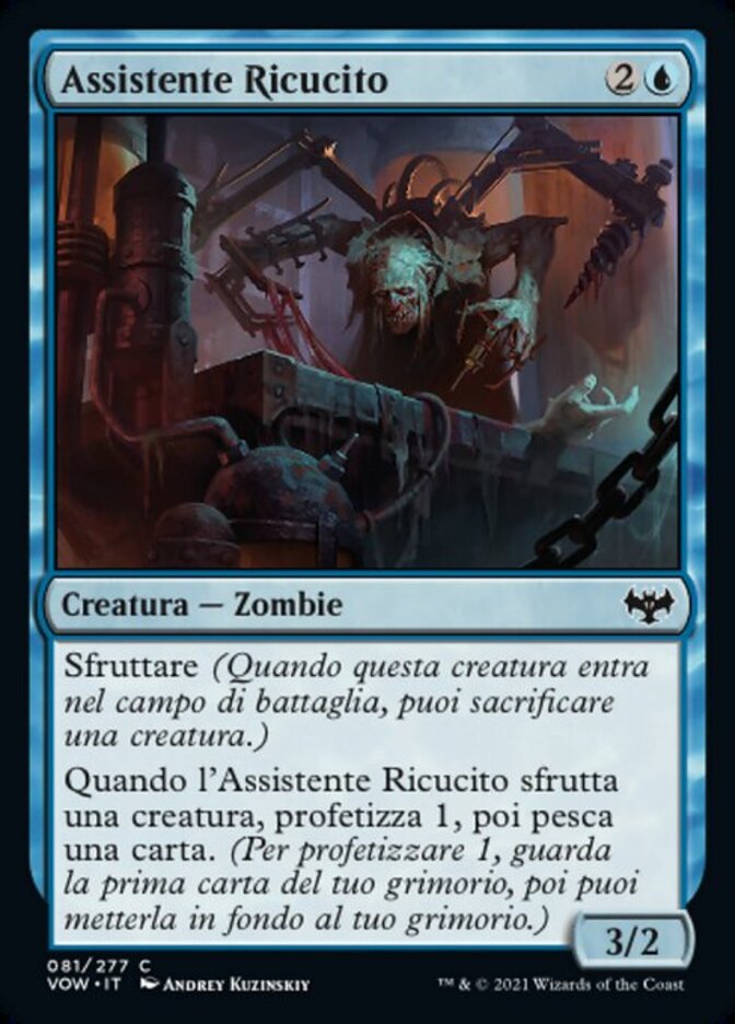 | Rules | Exploit (When this creature enters the battlefield, you may sacrifice a creature.) When Stitched Assistant exploits a creature, scry 1, then draw a card. (To scry 1, look at the top card of your library, then you may put that card on the bottom of your library.) |