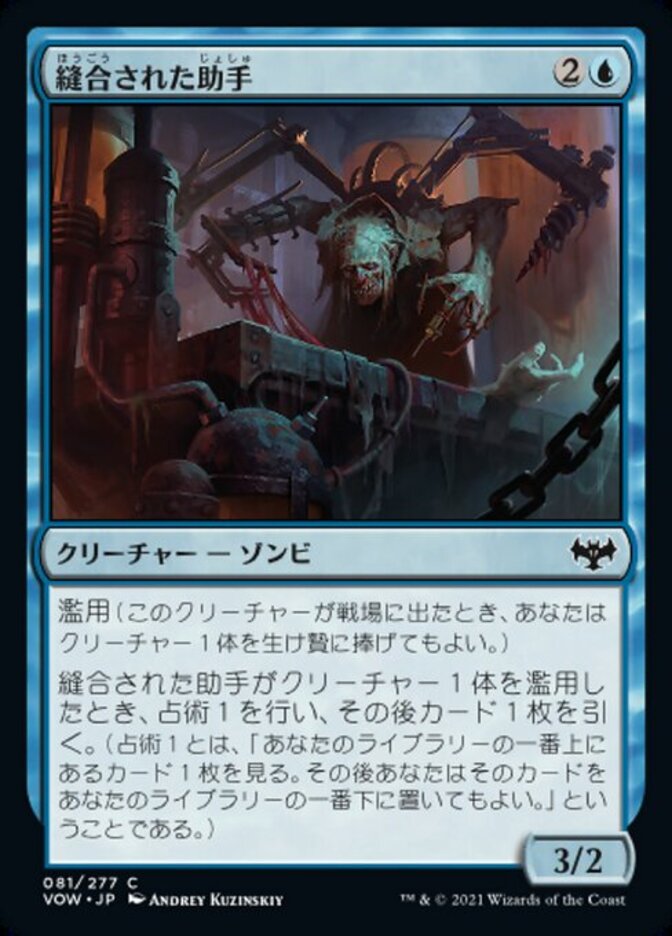 | Rules | Exploit (When this creature enters the battlefield, you may sacrifice a creature.) When Stitched Assistant exploits a creature, scry 1, then draw a card. (To scry 1, look at the top card of your library, then you may put that card on the bottom of your library.) |