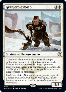 | Rules | When Stoic Farmer enters the battlefield, search your library for a basic Plains card and reveal it. If an opponent controls more lands than you, put it onto the battlefield tapped. Otherwise put it into your hand. Then shuffle. Foretell (During your turn, you may pay and exile this card from your hand face down. Cast it on a later turn for its foretell cost.) |