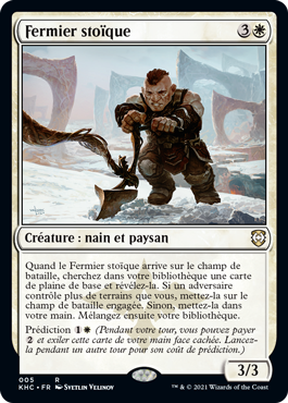 | Rules | When Stoic Farmer enters the battlefield, search your library for a basic Plains card and reveal it. If an opponent controls more lands than you, put it onto the battlefield tapped. Otherwise put it into your hand. Then shuffle. Foretell (During your turn, you may pay and exile this card from your hand face down. Cast it on a later turn for its foretell cost.) |