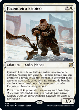 | Rules | When Stoic Farmer enters the battlefield, search your library for a basic Plains card and reveal it. If an opponent controls more lands than you, put it onto the battlefield tapped. Otherwise put it into your hand. Then shuffle. Foretell (During your turn, you may pay and exile this card from your hand face down. Cast it on a later turn for its foretell cost.) |