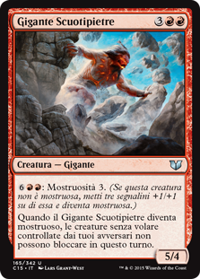 | Rules | : Monstrosity 3. (If this creature isn't monstrous, put three +1/+1 counters on it and it becomes monstrous.) When Stoneshock Giant becomes monstrous, creatures without flying your opponents control can't block this turn. |