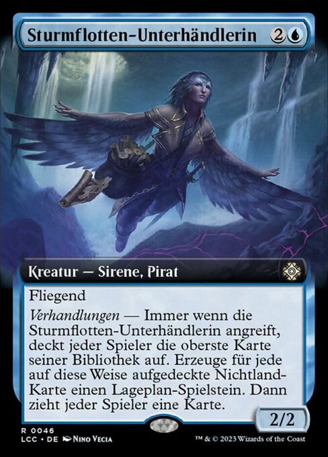 | Rules | Flying Parley — Whenever Storm Fleet Negotiator attacks, each player reveals the top card of their library. For each nonland card revealed this way, you create a Map token. Then each player draws a card. (A Map token is an artifact with ", , Sacrifice this artifact: Target creature you control explores. Activate only as a sorcery.") |
