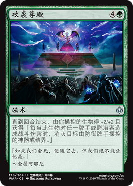 | Rules | Until end of turn, creatures you control get +2/+2 and gain "Whenever this creature deals combat damage to a player or planeswalker, destroy target artifact or enchantment defending player controls." |
