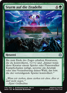 | Rules | Until end of turn, creatures you control get +2/+2 and gain "Whenever this creature deals combat damage to a player or planeswalker, destroy target artifact or enchantment defending player controls." |