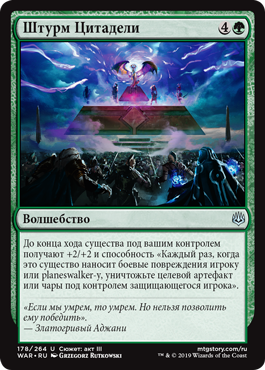 | Rules | Until end of turn, creatures you control get +2/+2 and gain "Whenever this creature deals combat damage to a player or planeswalker, destroy target artifact or enchantment defending player controls." |