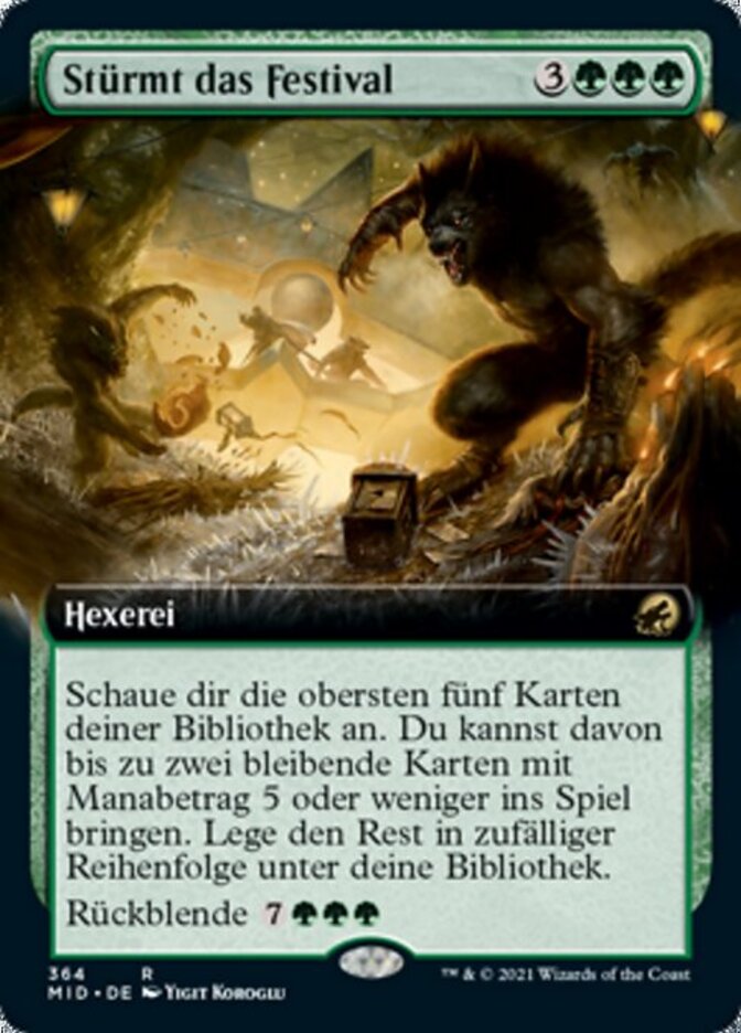 | Rules | Look at the top five cards of your library. You may put up to two permanent cards with mana value 5 or less from among them onto the battlefield. Put the rest on the bottom of your library in a random order. Flashback (You may cast this card from your graveyard for its flashback cost. Then exile it.) |