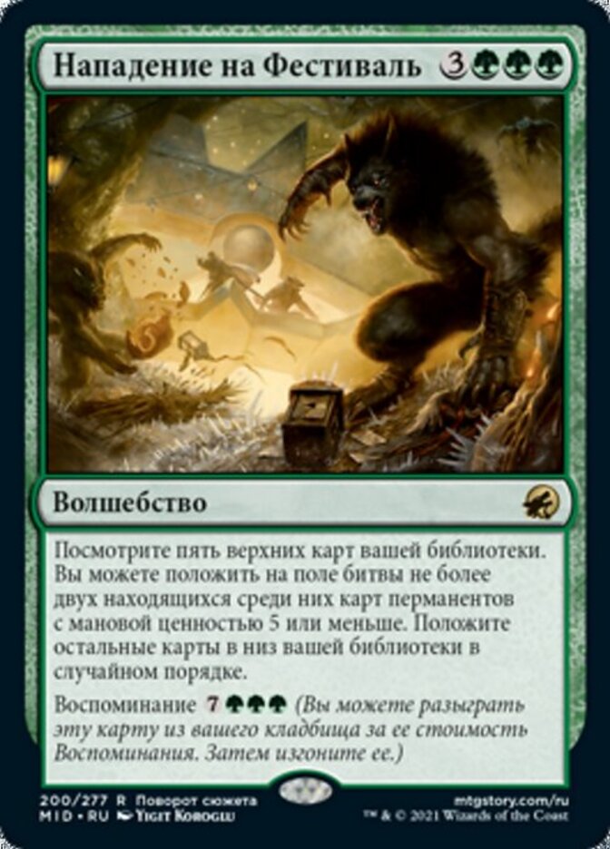 | Rules | Look at the top five cards of your library. You may put up to two permanent cards with mana value 5 or less from among them onto the battlefield. Put the rest on the bottom of your library in a random order. Flashback (You may cast this card from your graveyard for its flashback cost. Then exile it.) |