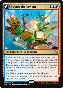 | Rules | Whenever one or more creatures you control deal combat damage to a player, create a Treasure token. (It's an artifact with ", Sacrifice this artifact: Add one mana of any color.") At the beginning of your end step, if you control five or more artifacts, transform Storm the Vault. // (Transforms from Storm the Vault.) : Add one mana of any color. : Add for each artifact you control. |