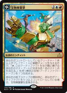 | Rules | Whenever one or more creatures you control deal combat damage to a player, create a Treasure token. (It's an artifact with ", Sacrifice this artifact: Add one mana of any color.") At the beginning of your end step, if you control five or more artifacts, transform Storm the Vault. // (Transforms from Storm the Vault.) : Add one mana of any color. : Add for each artifact you control. |