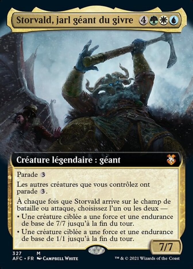 | Rules | Ward Other creatures you control have ward . Whenever Storvald enters the battlefield or attacks, choose one or both — • Target creature has base power and toughness 7/7 until end of turn. • Target creature has base power and toughness 1/1 until end of turn. |