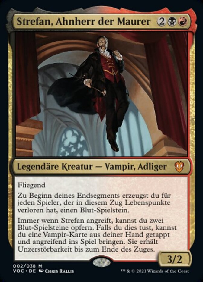 | Rules | Flying At the beginning of your end step, create a Blood token for each player who lost life this turn. Whenever Strefan attacks, you may sacrifice two Blood tokens. If you do, you may put a Vampire card from your hand onto the battlefield tapped and attacking. It gains indestructible until end of turn. |