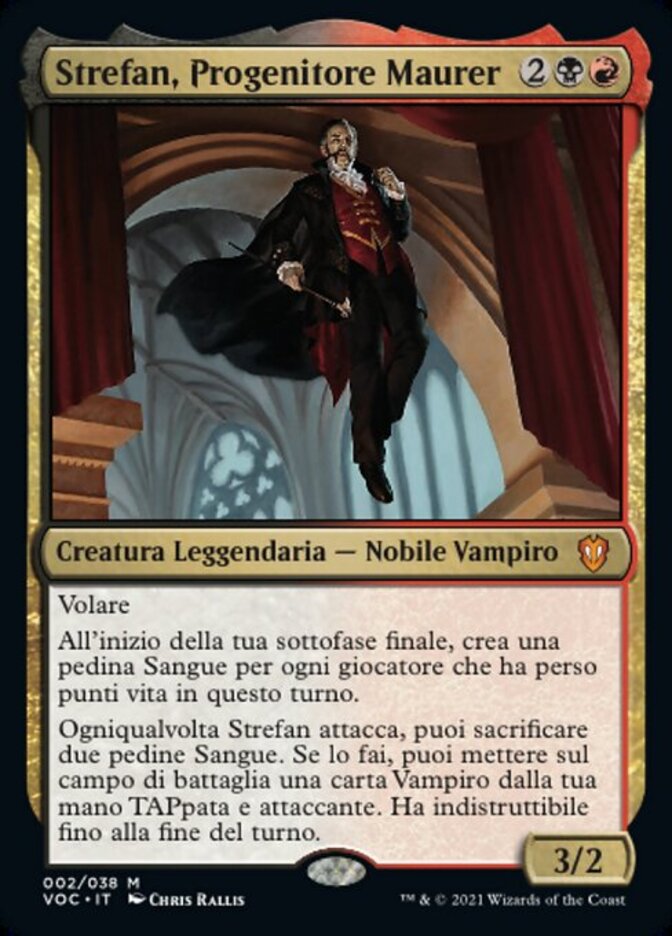 | Rules | Flying At the beginning of your end step, create a Blood token for each player who lost life this turn. Whenever Strefan attacks, you may sacrifice two Blood tokens. If you do, you may put a Vampire card from your hand onto the battlefield tapped and attacking. It gains indestructible until end of turn. |