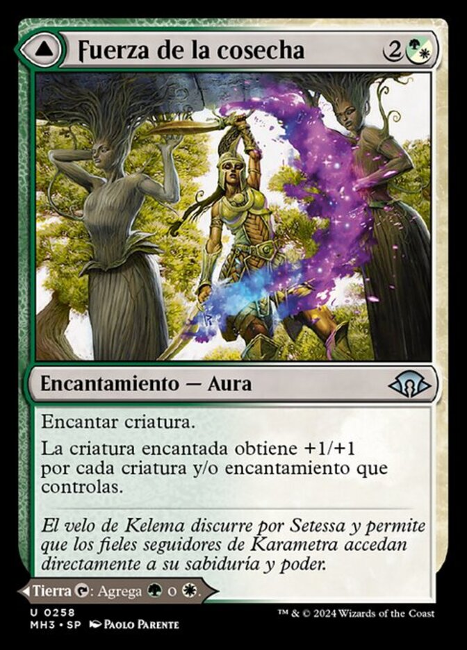| Rules | Enchant creature Enchanted creature gets +1/+1 for each creature and/or enchantment you control. // Haven of the Harvest enters the battlefield tapped. : Add or . |