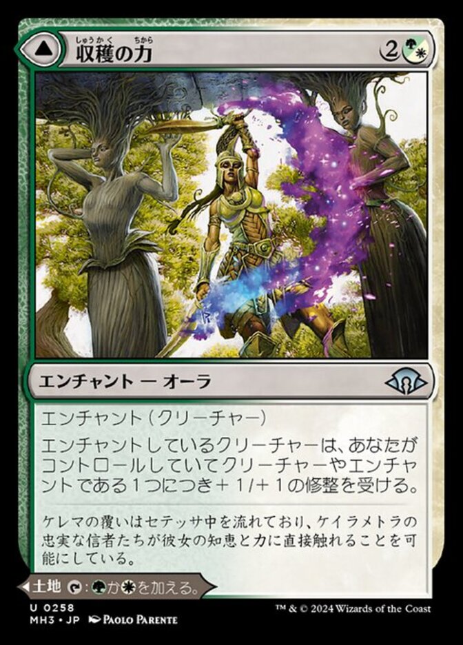 | Rules | Enchant creature Enchanted creature gets +1/+1 for each creature and/or enchantment you control. // Haven of the Harvest enters the battlefield tapped. : Add or . |