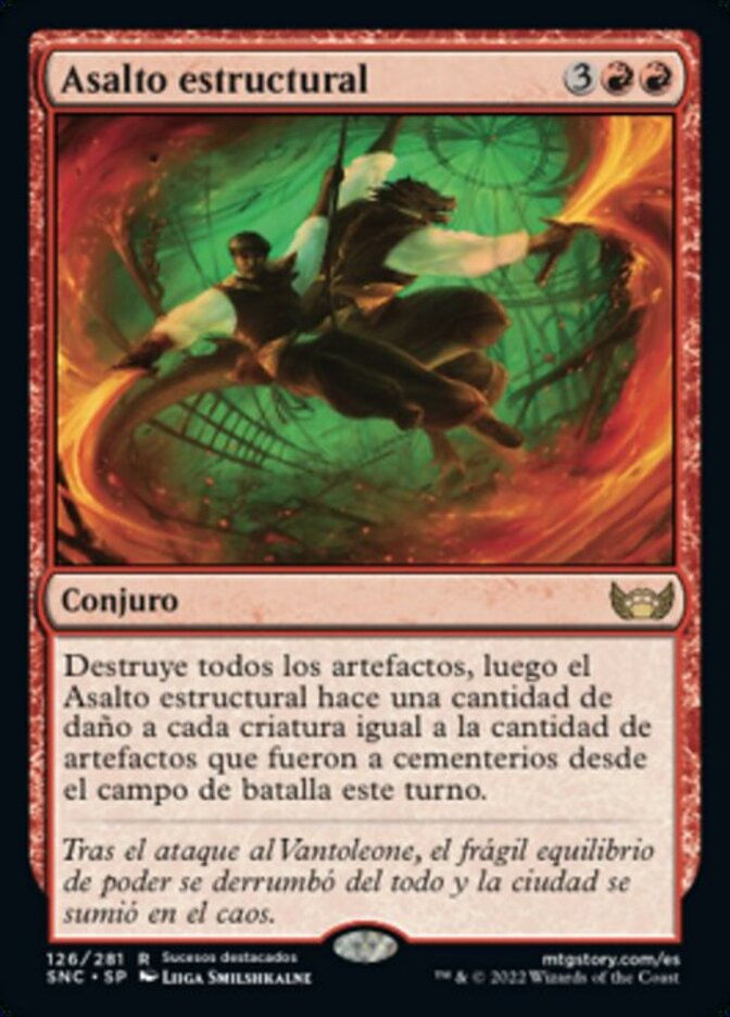 | Rules | Destroy all artifacts, then Structural Assault deals damage to each creature equal to the number of artifacts that were put into graveyards from the battlefield this turn. |