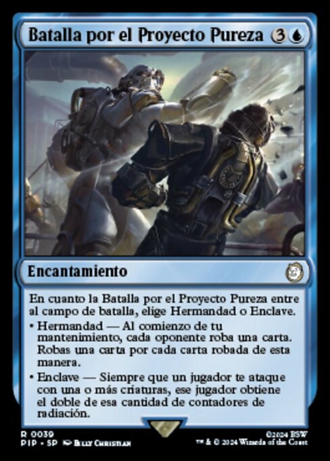 | Rules | As Struggle for Project Purity enters the battlefield, choose Brotherhood or Enclave. • Brotherhood - At the beginning of your upkeep, each opponent draws a card. You draw a card for each card drawn this way. • Enclave Whenever a player attacks you with one or more creatures, that player gets twice that many rad counters. |
