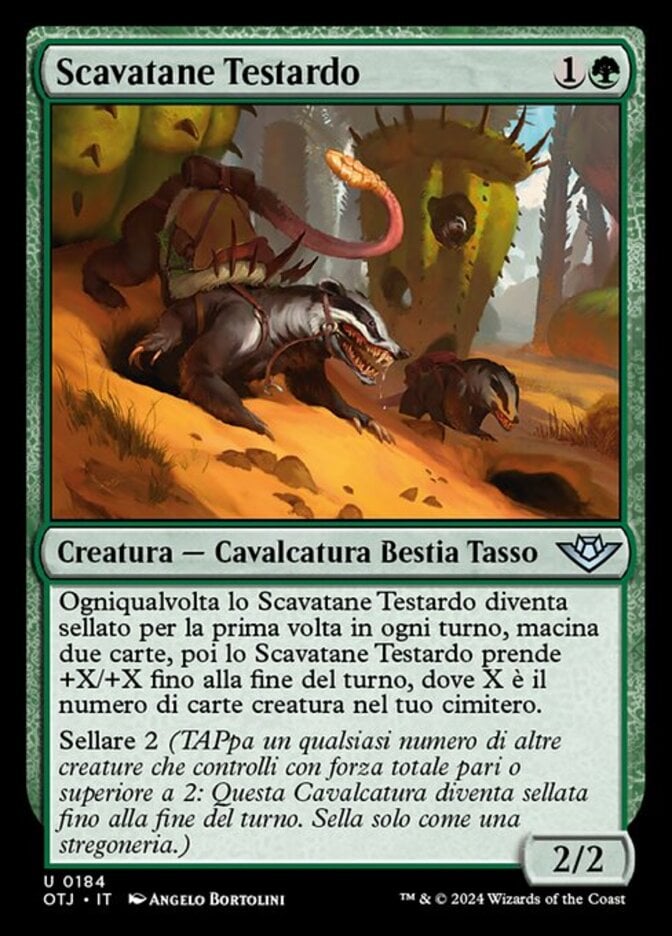 | Rules | Whenever Stubborn Burrowfiend becomes saddled for the first time each turn, mill two cards, then Stubborn Burrowfiend gets +X/+X until end of turn, where X is the number of creature cards in your graveyard. Saddle 2 (Tap any number of other creatures yo control with total power 2 or more: This Mount becomes saddled until end of turn. Saddle only as a sorcery.) |