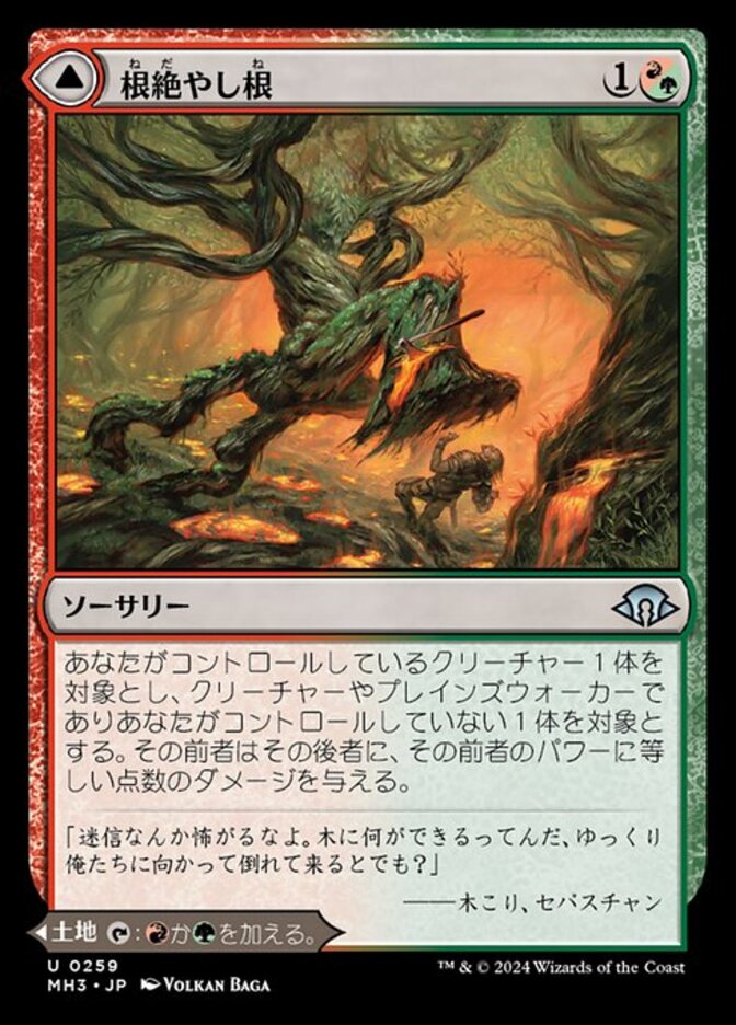 | Rules | Target creature you control deals damage equal to its power to target creature or planeswalker you don't control. // Burnwillow Clearing enters the battlefield tapped. : Add or . |