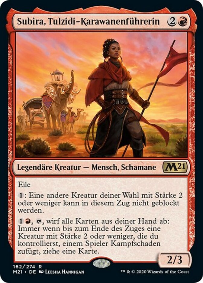 | Rules | Haste : Another target creature with power 2 or less can't be blocked this turn. , , Discard your hand: Until end of turn, whenever a creature you control with power 2 or less deals combat damage to a player, draw a card. |