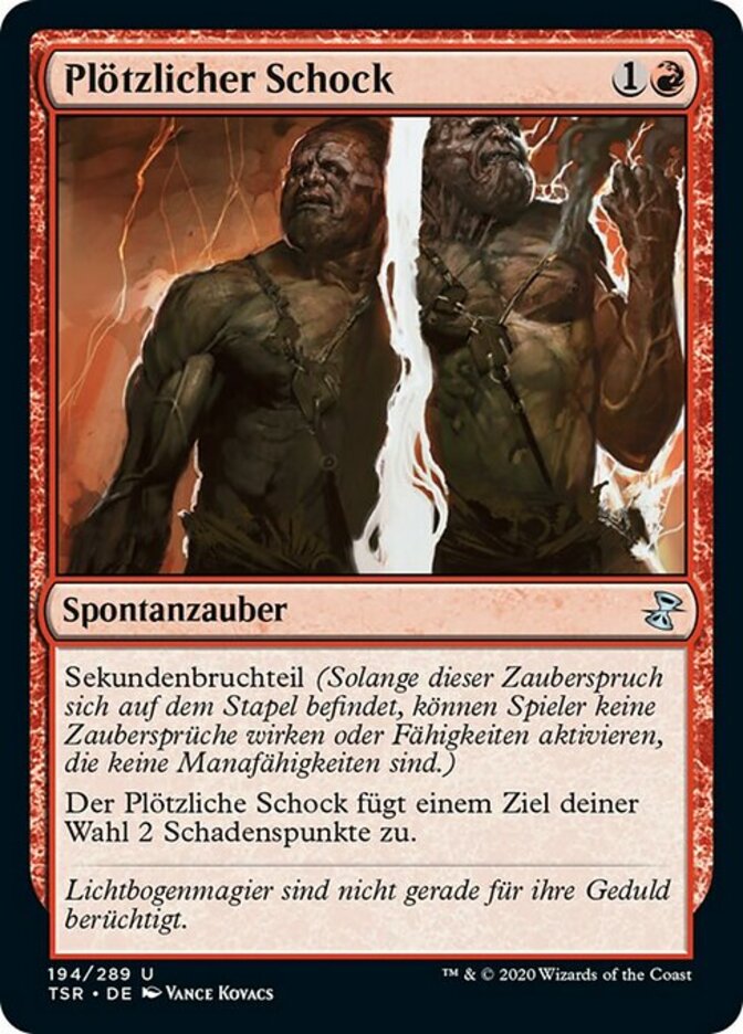 | Rules | Split second (As long as this spell is on the stack, players can't cast spells or activate abilities that aren't mana abilities.) Sudden Shock deals 2 damage to any target. |