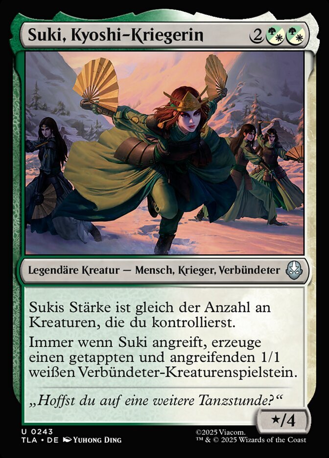 | Rules | Suki's power is equal to the number of creatures you control. Whenever Suki attacks, create a 1/1 white Ally creature token that's tapped and attacking. |